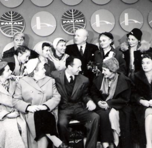 The women arrived at Idlewild Airport (before it was re-named JFK in 1963) at the Pan Am offices (Pan American Airlines funded the airfare for the trip) for their rehabilitative trip to the U.S. Above, Norman Cousins is seated center, front row. Dr. William Hitzig center, rear.