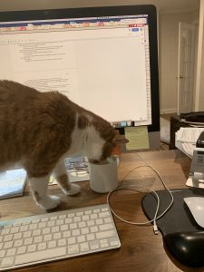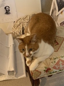 She started venturing out of Katherine’s bedroom, coming into my office to hang out on my desk while I was writing. I fell in love with her and wrote her into The Golden Doves as Arlette’s cat at the cafe where she works.