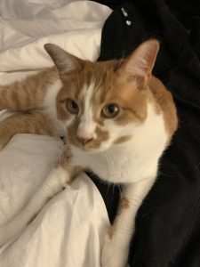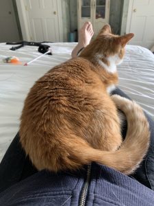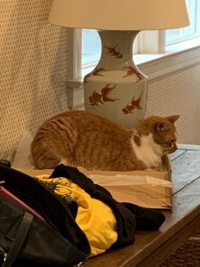 When our daughter Katherine came to stay with us in Connecticut during COVID she brought her cat Saffron with her from Brooklyn. A former street cat, Saffron knew how to defend her turf and lets just say biting was a favorite activity. But after a while she got used to us and our dog Oliver after a while and became queen of the house.