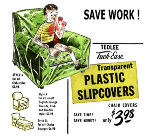 Growing up in suburban Massachusetts our across the street neighbors The Aleos had an ultra modern home with white carpet and plastic-slipcovered living room furniture (and copper jello molds hung on the kitchen wall, but that’s another story). On the rare occasion the neighborhood kids were allowed into the house I would stare at the slippery sofa, puzzled by why anyone would want to do that to furniture. I’m relieved that slipcovers have gone away and, unlike the mullet, show no sign of returning.