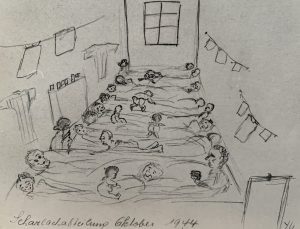 In the later stages of the war many women arrived at the camp pregnant and this posed a problem for the Nazi camp staff. Desperate for workers and concerned that many of the new mothers became despondent when their newborns were taken away and were unable to be productive, they cleared out one of the barracks and created a special ward for the mothers. They named it the kinderzimmer or children’s room, a maternity block, as shown in the prisoner illustration above.