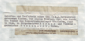 Translation: Birth and baptismal certificate of one of the children born in K.L.Ravensbruck. Little Manfred, who miraculously survived the concentration camp, found godparents in Wein.