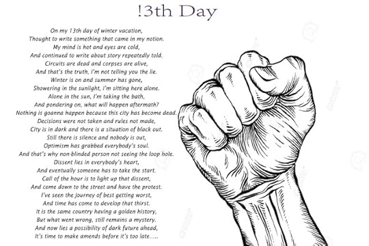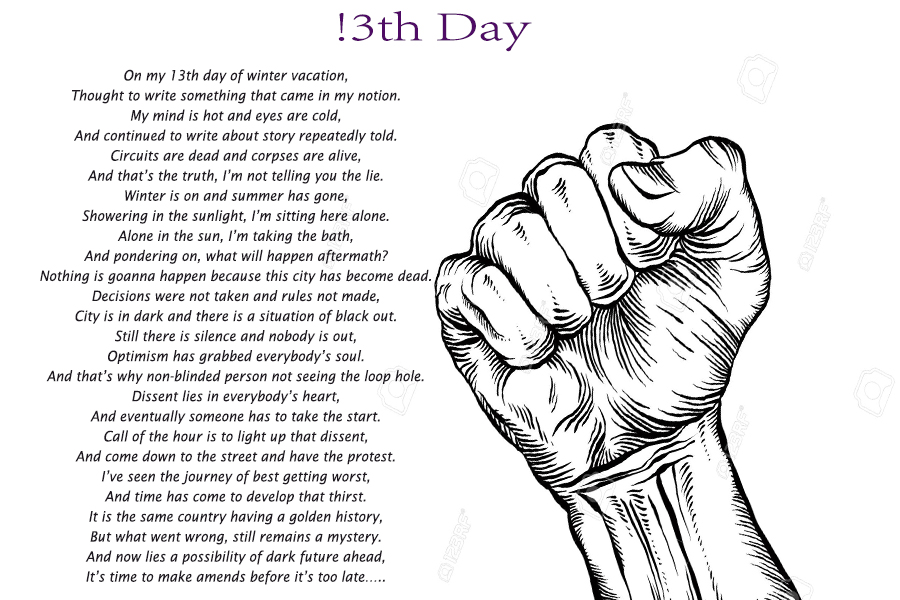 On my 13th day of winter vacation,Thought to write something that came in my notion.My mind is hot and eyes are cold,And continued to write about story repeatedly told.Circuits are dead and corpses are alive,And that’s the truth, I’m not telling you the lie.Winter is on and summer has gone,Showering in the sunlight, I’m sitting here alone.Alone in the sun, I’m taking the bath,And pondering on, what will happen aftermath?Nothing is goanna happen because this city has become dead.Decisions were not taken and rules not made,City is in dark and there is a situation of black out.Still there is silence and nobody is out,Optimism has grabbed everybody’s soul.And that’s why non-blinded person not seeing the loop hole.Dissent lies in everybody’s heart,And eventually someone has to take the start.Call of the hour is to light up that dissent,And come down to the street and have the protest.I’ve see the journey of best getting worst,And time has come to develop that thirst.It is the same country having a golden history,But what went wrong, still remains a mystery.And now lies a possibility of dark future ahead,It’s time to make amends before its too late…..