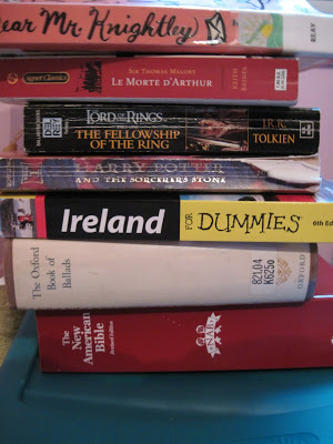 I'm also reading Le Morte d'Arthur, by Sir Thomas Malory, and rereading The Fellowship of the Ring, by J. R. R. Tolkien, and The Sorcerer's Stone, by J. K. Rowling. And there's a book for my super-secret plans for next spring. It's titled Ireland for Dummies. You can probably guess what my super-secret plans are... Oh, and I have The Oxford Book of Ballads for a project I'm working on, and a new Bible for a pre-confirmation course I'm taking this year. Yeah...