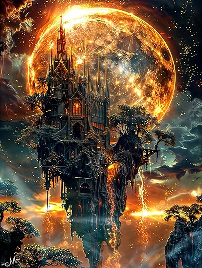 Beneath the towering spires of a cathedral that clung to the sky like roots woven through mist lay the Sepulcher of the Shattered Moon. Its enigmatic presence whispered through the air, the building itself suspended on tendrils of charred wood and blackened stone, held aloft by the unseen forces of the Eldritch. The moon above, massive and fractured, bled amber light that seeped into the cracks of the sepulcher and cast shadows like phantoms in the gloom.