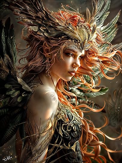 Her fiery, coppery hair flows like a cascade of autumn leaves caught in a whispering wind, framing eyes that shimmer with the colors of twilight — golden amber flecked with hints of flame. Her wings, adorned with intricate feathers of midnight black and molten gold, stretch wide as a raven in flight, marking her as one with the sacred birds of her people. Her ceremonial garb is woven with the essence of nature itself, a living tapestry of vines, leaves, and feathers that resonate with the magic she commands.