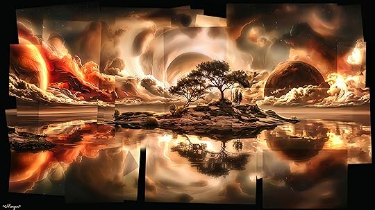 In this piece, I wanted to explore that dialogue: the meeting point where matter and meaning align. The fiery horizon reflects not destruction, but the transformation that comes when we allow our inner seasons to turn. The light that burns through the clouds is the same light that reshapes us, clarifying, cleansing, and revealing what remains when illusion falls away.
