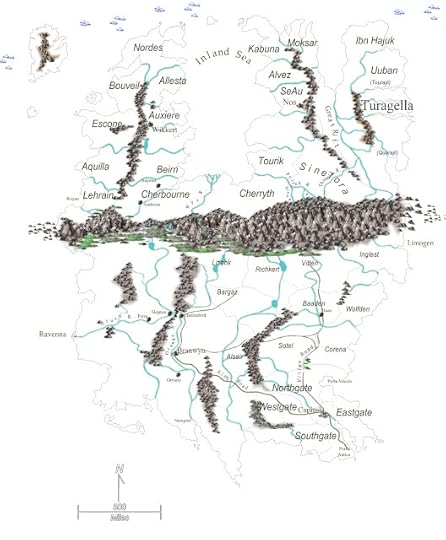 One-by-one the other dragons returned home or landed to enjoythe setting sun until Swallowtail followed alone. At sunset they neared thenorthern edge of the mountain range where the Blois spilled over the falls intothe foothills of Cherryth. There were no true borders here, only ragged lineson the maps indicating where passage south was dangerous for all but trainedclimbers.