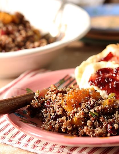 While the quinoa is cooking, soak the dried cranberries in the pomegranate juice to plump.