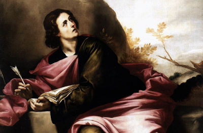 John the EvangelistThere's a lot wrong with the painting above, not the least of which is the lack of a beard. John wrote his Gospel some thirty years after Jesus was crucified, so he would be about 45 years old. Since he's not living in Judea any more, is he taking on the fashions of the gentiles? I doubt that. And that heavy tome he's writing! The first Bibles, containing all the books of the Old and New Testaments, would not be produced for another 3- to 400 years. He could write his Gospel, Revelation, and Letters in that tome and have room to write it again many times.