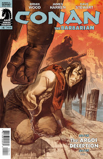 MEANWHILE, Dark Horse's CONAN THE BARBARIAN No. 4 kicks off a new story arc with THE ARGOS DECEPTION, in which Conan agrees to be part of a scam headed by his new girlfriend, Belit, the captain of an infamous pirate ship. It's a good set-up issue, featuring artwork by James Harren that's much better than the goofy-looking renderings of Becky Cloonan that all but ruined the first 3 issues. Good stuff.