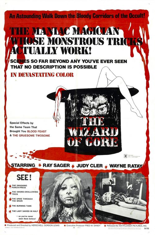 I FINALLY got to see two films from H.G. Lewis on the big screen: one of my all time favorites, BLOOD FEAST (1963), played at the Anthology Archives as part of a Lewis retrospect, and THE WIZARD OF GORE (1970) was featured at the Museum of the Moving Image as part of their "Magicians on Film" series.