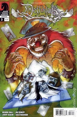 DETHKLOK No. 3: One of Dark Horse Comic's most entertaining titles, everyone's favorite death metal band now has a 30-story tall (and 10,000 foot long) "Dethtrain,' which the band plans to perform a cross-country tour atop as screaming fans watch the show doing ludicrous speeds. During their maiden performance, The Train Ghoul takes up residence in a young metalhead who is bent on killing Mashed Potato Johnson, an elderly blues guitar legend who once taught Dethklok's guitarists some major chops. Comics just don't get more fun than this demented series, a spin-off of the Adult Swim TV show. Add a plus here for one insane ending...