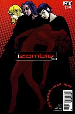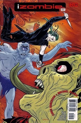 iZombie # 9 & 10: Vertigo's retro-looking female monster mash finally gets our favorite zombie girl, Gwen, out on a date with one of the vampire hunters. Of course she continues to have flashbacks, and is also contacted by her former college friend's dead mother to deliver a message. Issue 10 ends with one of the vampire hunters being held hostage by the vampire girls, while ghoul scientist Galatea continues to conduct strange drug experiments on unwilling subjects with the help of Gwen's red-haired vampire buddy, Claire. Ghost girl Ellie also has some fun now that she has learned how to temporarily possess people. iZombie's a pulpy, entertaining, well written series with addictive artwork courtesy of Michael Allred. Grab a bunch of issues as you'll surely be craving more as soon as you dig in (there's a trade edition now available of the first several issues).