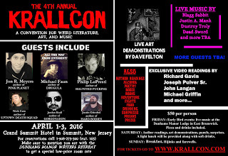 At the 2016 KRALLCON, to be held April 1-3 2016 (this time in Summit, NJ at the beautiful Grand Summit Hotel), I'll be performing an acoustic death metal song with Christopher Ropes, giving an introductory lecture on the films of Herschell Gordon Lewis, and I believe I'll even be squeezing a reading in somewhere (all will happen on the 2nd). Either way this is a great little convention for fans of weird literature, music, art, and films. Hope to see some of you there. More info here: KRALLCON 2016