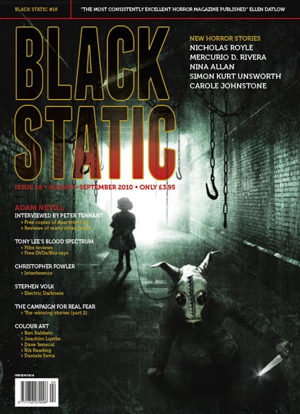 After another great film column from Stephen Volk, as well as a continuation of Christopher Fowler's 2nd installment of a short story competition (the second set of winning 10 shorts are printed, too), we dive head-first into this issue's 5 fiction pieces, and as usual there isn't a sour one in the bunch. Nina Allan's opening aquatic offering ORINOCO will make you look at angelfish in a whole new way, Carole Johnstone's BETWEEN A ROCK AND A HARD PLACE gives a nice look at one woman's paranoia, and Simon Kurt Unsworth's A MAN OF ICE AND SORROW is one of the creepiest snowman-themed stories I've read in quite a while. Nicholas Royle's THE OBSCURE BIRD is a standard yet very well told tale of a woman who discovers why her husband's been acting so weird at night, and Mercurio D. Rivera's TU SUFRIMIENTO SHALL PROTECT US deals with a man trying to understand the annoying sounds that continue to disturb his apartment, complete with an unexpected conclusion.