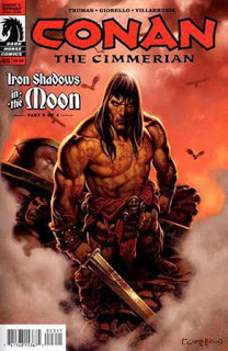 Picking right up where issue 22 left off, CONAN THE CIMMERIAN No. 23 (which is part 2 of the 4-issue IRON SHADOWS IN THE MOON saga) provides some tight suspense as Conan and Olivia explore the (seemingly) deserted island they've found themselves on. Huge, black iron statues cause Olivia to have a nightmare that turns into a premonition. Our duo flees for their boat only to find it destroyed.
