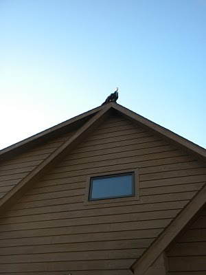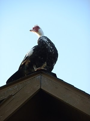 Seriously. Heck of a name with which to saddle a duck. I call him Mr. Bodgepie. When Melissa bought him, his wings had been clipped. So for two months he just waddled around the farm. But yesterday I heard what sounded like a child running around on our roof. Concerned because our steep roof is not the safest of playgrounds, I went to investigate.