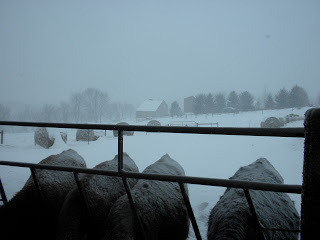 Sheep are amazingly hardy. Their wool is coated with snow, but when I stuck my hand deep into one ewe's fleece, she was toasty warm. Blizzards are an inconvenience for our sheep, nothing more.