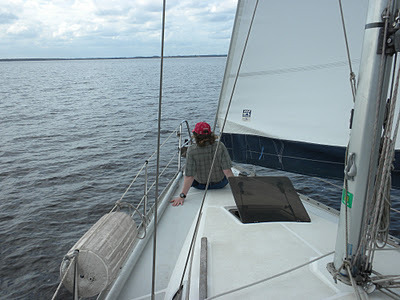 We went sailing one afternoon with Sandy and Rick. Here's the Head Farmer at the bow of the boat, watching to make sure we don't hit any crab pots.