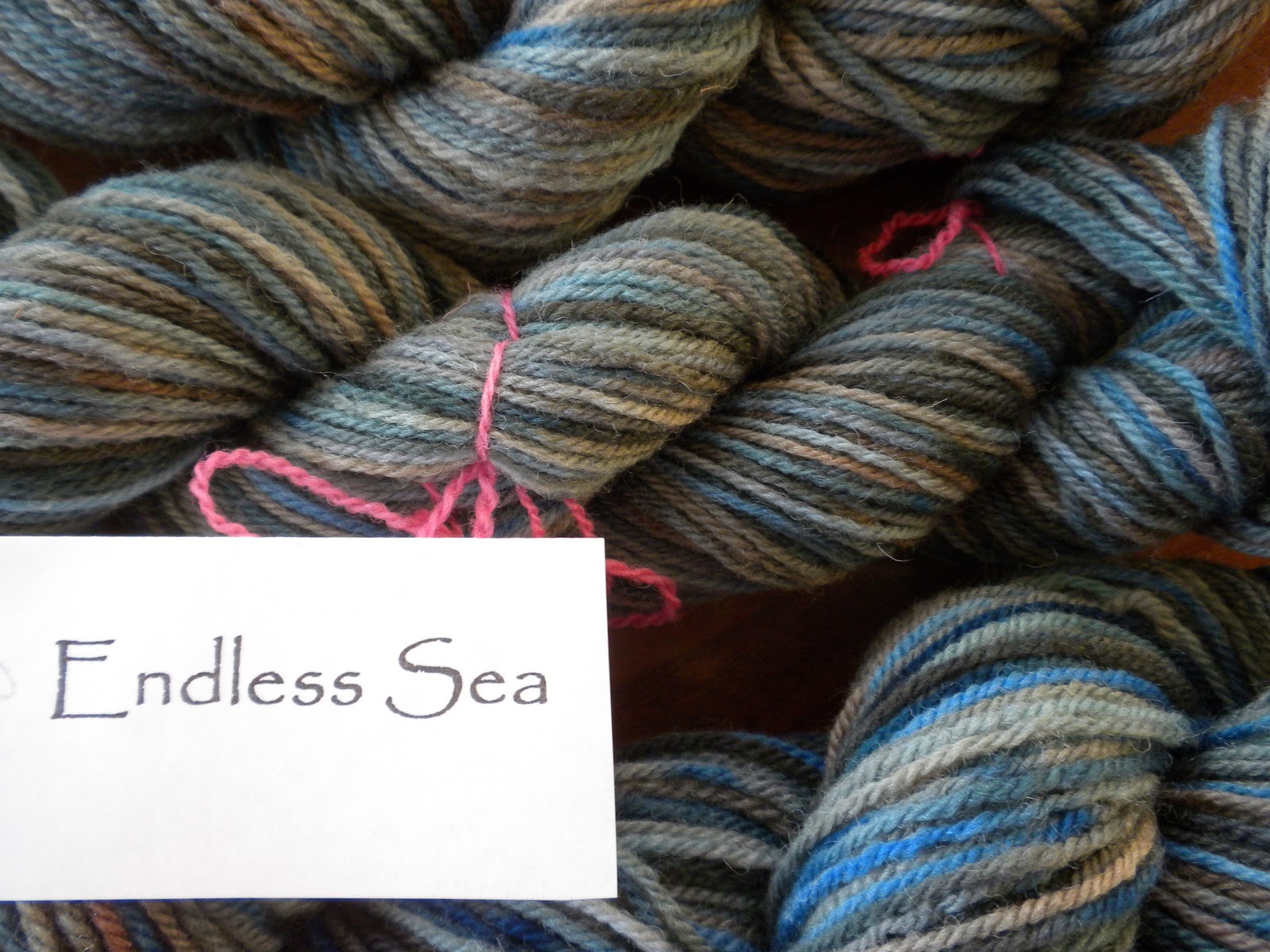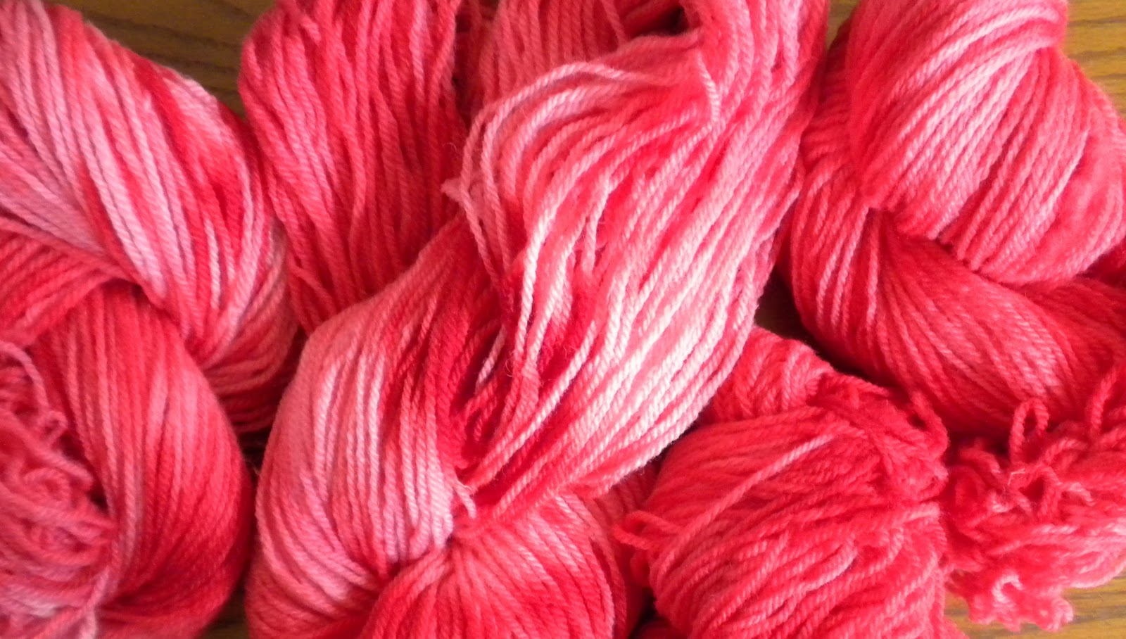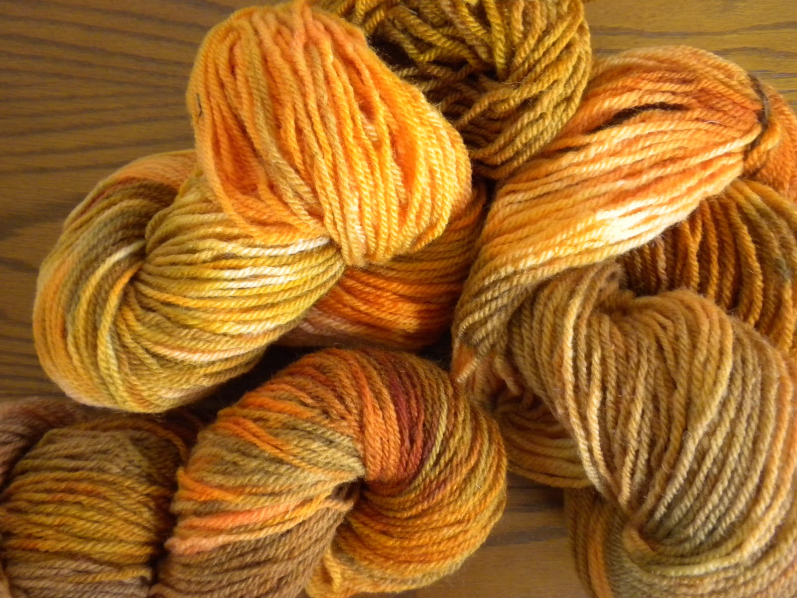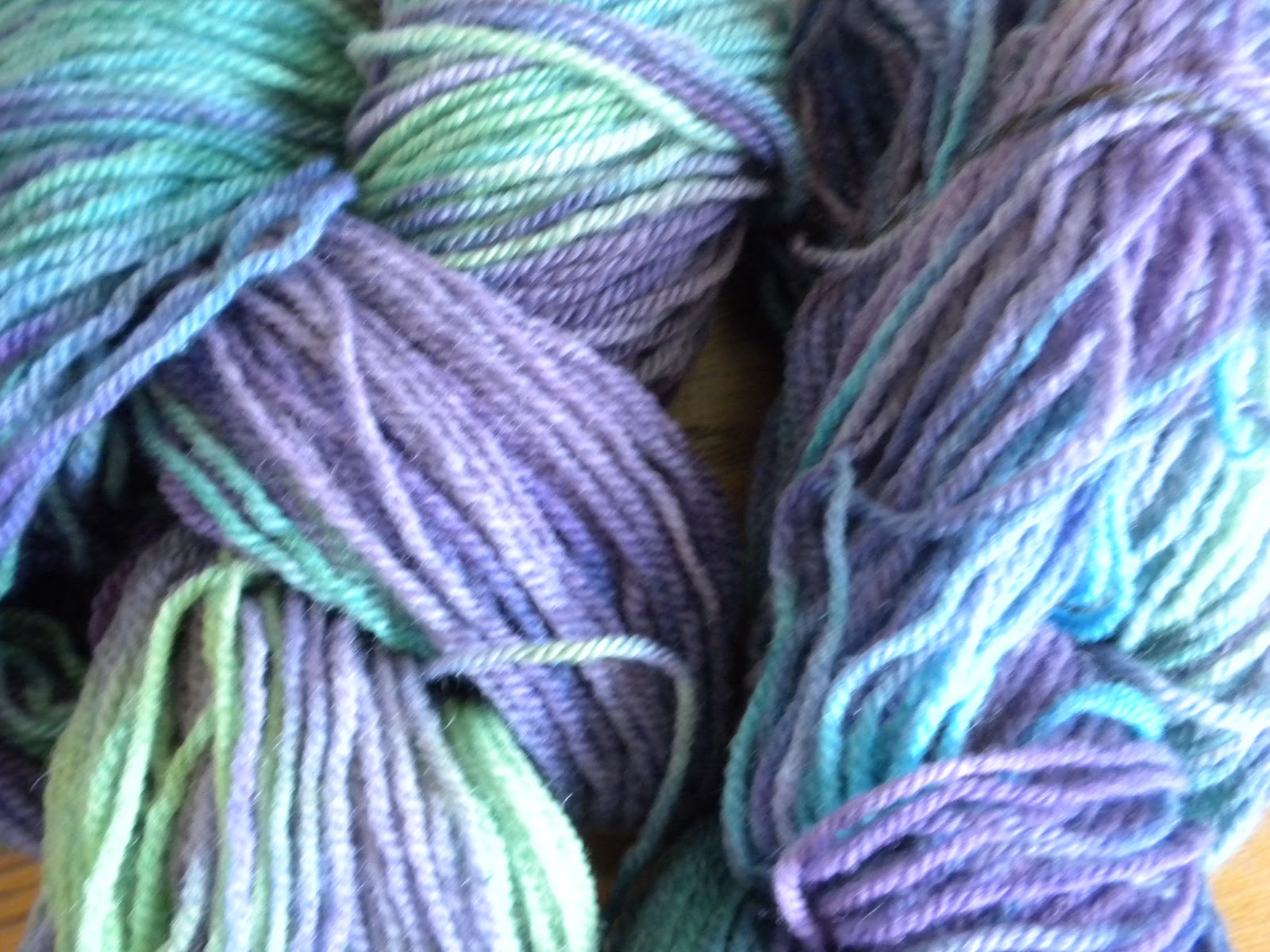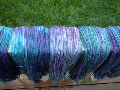 A few weeks ago it hit me: "Hey, I could get some help with this." So here are four of the yarns I'll be selling in a month or two. (Please note---they will be tidied up before selling---dyeing sometimes gets things a bit tangled.)