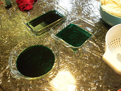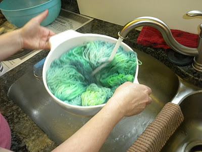 We flipped the yarn over, did the other side if needed, then rolled the skeins up like caramel rolls in plastic wrap and cooked them on the stove for awhile. (This is how the color sets.)