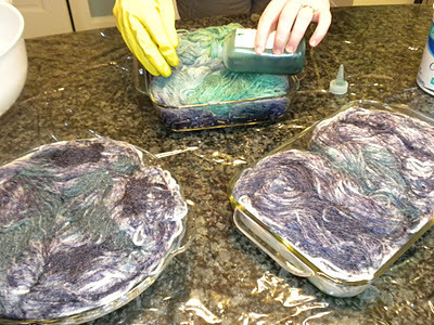 ...add the skeins and more dye. At this stage the yarn doesn't look that great, but the final yarn is the very last photo in this blog---big difference. We then cooked these containers in the microwave!