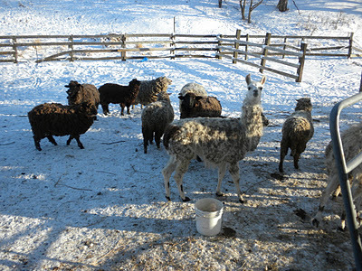The sheep and llamas that had the run of the place could eat snow, but the three stud muffins locked in the barn had nothing. (I learned today that llama stud muffins are called stallions.) We could find no source of water.
