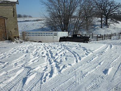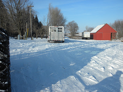 Sunday morning we drove to the motel, and led them to the llamas. Jeremy's trailer and truck weren't going to make that hill, so he backed it to the edge of the hill. We set up panels running from the barn, creating a walk-way for the llamas.