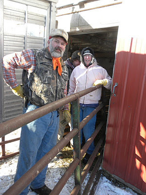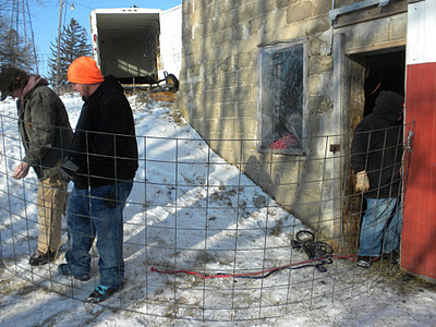 They drove all the animals into the barn, then separated the sheep from the llamas (except one. The owner requested that a certain sheep stay with its llama buddy.) Here are Drew and Bunnie setting up panels from the barn to the back of the trailer.