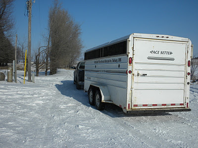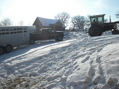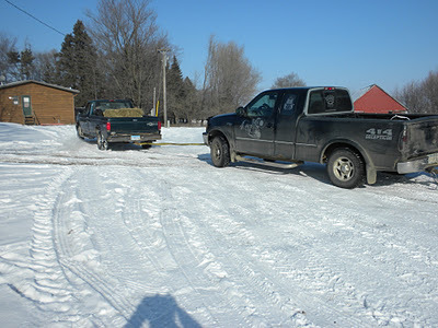 Jeremy's truck had trouble pulling the trailer up the hill, so I backed up our truck, and Melissa pulled him forward.