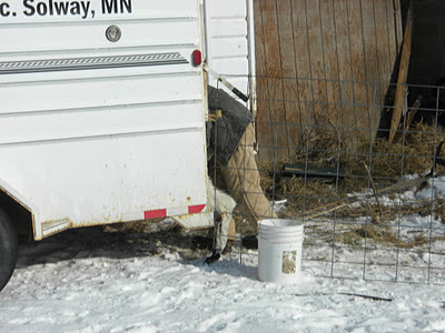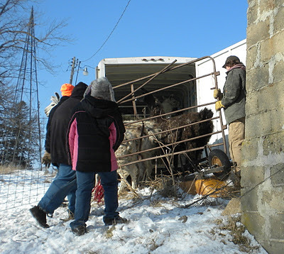 It's been a stressful week. Melissa brought the inside llamas snow. Twice she brought a few buckets of water from home, but of course the water freezes before the animals drink it all. We don't have portable hay bales (ours weigh 900 pounds) so Melissa flaked off some of the hay and drove it to the abandoned animals.