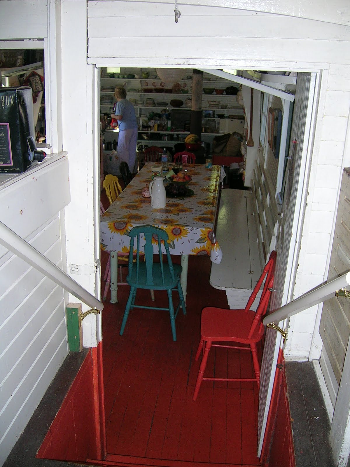 The kitchen is an old river boat, now surrounded by a deck.