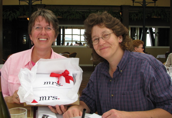 At the restaurant with wedding party after the ceremony, opening gifts. Mrs. and Mrs. pillowcases!