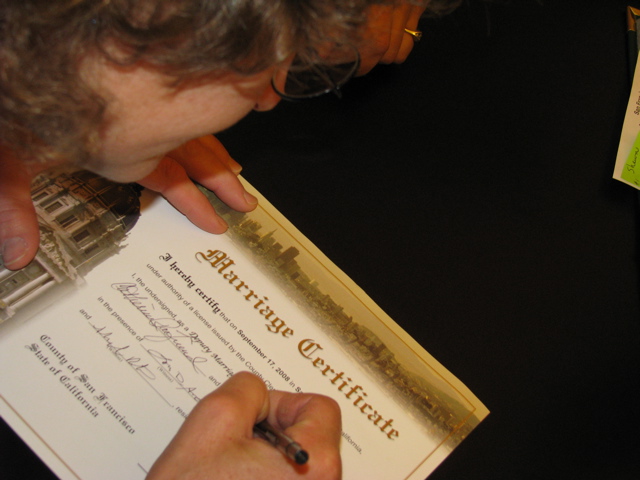 Melissa signing the marriage certificate...