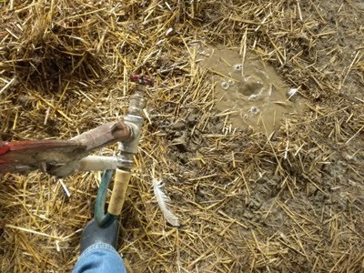 She dug and shoveled until the water drained out, but then we had to figure out what was going on. She turned on the hydrant again, and about 30 seconds later, water came bubbling up through the dirt floor. We quickly shut it off again.
