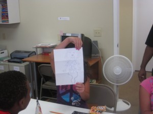 After that, we had a long discussion about what goes into creating a character. The details, the quirks, the history, all the things they love about their favorite characters, using super heroes as our example. And we gave those characters a goal they had to reach. The kids were free to come up with anyone they wanted and some even drew their creations. I quickly realized that the secret to conducting a successful workshop is to shut up and get out of the way of kids’ imaginations.