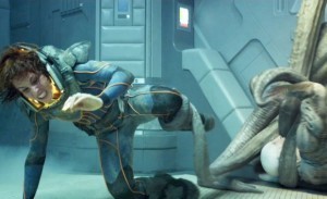 What we do have is an attempt to be the thinking man’s Alien. While the production doesn’t skimp on the richly imagined, intricate visuals designed (plenty of H.R. Giger inspired eye-candy), it’s also like the movie forgot some of the lessons of Alien. It forgot how to build tension. There no extended silences, instead orchestral surges broke any budding mood. The characters often did stupid things for no reason other than to service a sense of “doing something,” because of a lot of the action happened for no particular reason. Or worse, made little sense: even the movie’s best (only?) cringe worthy scene, with Shaw climbing into an auto-surgery machine to eliminate the alien within, yet not even a C-section of a tentacled alien stops her from channeling Sigourney Weaver for the rest of the movie.