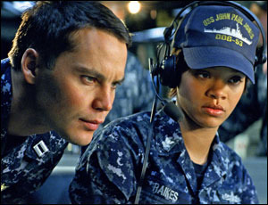 At Oahu, Hawaii, where ne’er-do-well jobless slacker Alex Hopper (Taylor Kitsch, John Carter, TV’s Friday Night Lights) has a propensity of making bad choices, being impetuous, and having anger issues. Luckily his older brother, Stone (True Blood) bails him out and encourages him to join him in the Navy. Physical therapist, Sam (Brooklyn Decker), who happens to be the daughter of U.S. Pacific Fleet commander Admiral Shane (Liam Neeson), finds Alex’s irresponsibility completely charming/sees his potential. This romance totters ahead despite the fact that Alex finds himself to be tossed out of the Navy on his ear when luckily the aliens show up and distract everyone.
