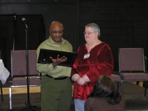 Awarded to Sara in the picture above: Words cannot express the depth of which this lady means to us. She is dedicated, resourceful, and opinionated…and she is a fighter, through and through. She inspires us, tasks us, and often times mothers us. She showers us with love and devotion and our appreciation of this woman knows no bounds. To Sara J. Larson, the heart and soul of the Indiana Horror Writers. (Bob Freeman)