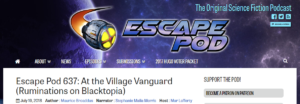 My story At the Village Vanguard (Ruminations on Blacktopia) is now up on the Escape Pod site, available as a read or listen. It’s one of my favorite short stories plus it lays the groundwork for much of my Afrofuturist universe.