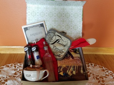 A decorative box containing measuring cups, ten recipes from the book, a potholder, a kitchen towel, pepper and salt grinders, kitchen utensils, and an olive oil dispenser