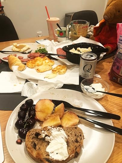 Sophie… by request: Pillsbury crescent rolls, Spam, peas, mashed and gobs of gravy. For Mom, fruit, olive bread smeared with labne, grilled halloumi, Q ginger beer.