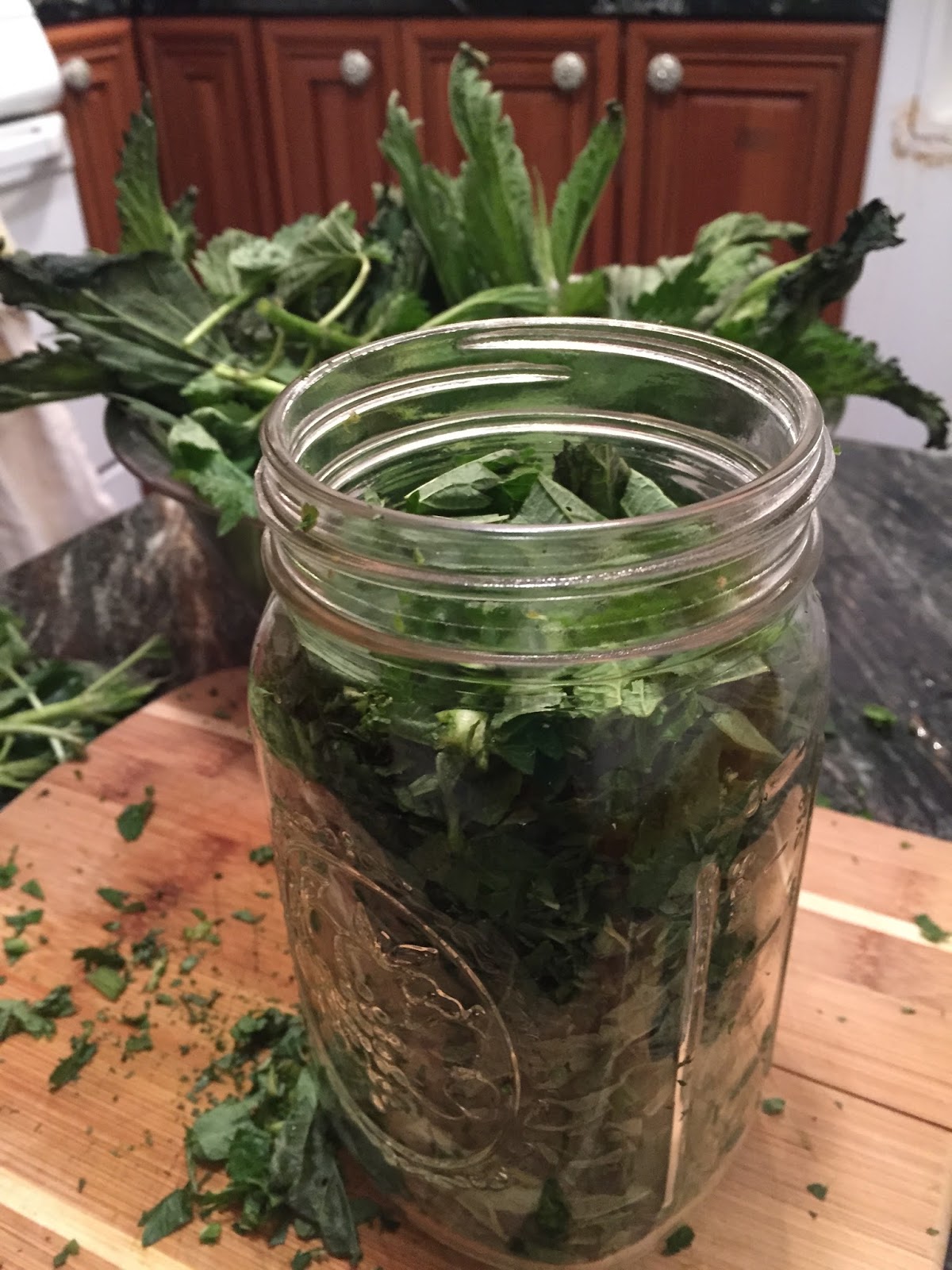 1. Buy organic, or pull from the earth where you’re sure there's no pesticide run off. You can use the herb fresh or dry. 2. If using fresh leaves, chop into small pieces. 3. Stuff a clean mason jar with the leaves.4. Make sure to completely cover the leaves with 80/100 proof vodka, brandy, gin, or even apple cider. Do not allow uncovered leaves, or else mold. Add more alcohol if needed.5. Seal. Shake every day and let sit, anywhere from three weeks to six. 6. When time is up, pour everything through cheesecloth and squeeze the excess.