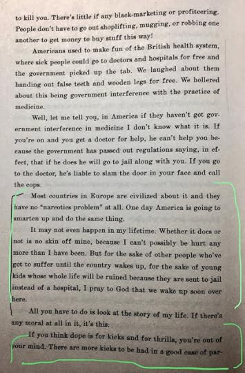 "He also said a man had come to him for advice recently because his twenty-year-old son had been hooked on dope. What did the judge advise him to do? Send the boy to England o school where doctors could treat him legally, cure him if they could, and if not, give him treatment legally just as if he had diabetes or something, so he could live a useful normal life."