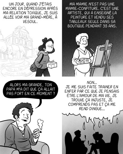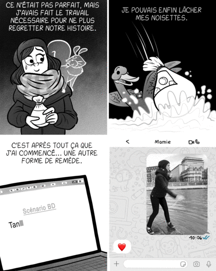 Et puisj’ai remonté la pente à boitant, beaucoup, puis de moins en moins. J’ai signé avec une super maison d’édition et je vais sortir ma première BD (wouhou !), j’ai quitté Paris pour Nantes, j’ai arrêté de fumer, j’ai repris du poids, j’ai fait du tri dans mon entourage, j’ai retrouvé 20€ dans une poche de manteau et la joie de vivre. Depuis je me suis mise à faire des vidéos/stories sur Instagram aussi. 2 ans et demi c’est beaucoup, finalement.