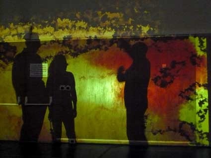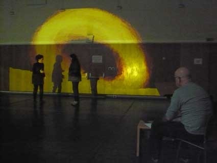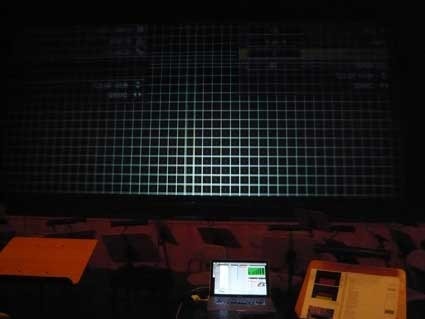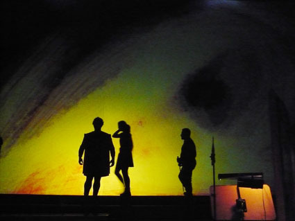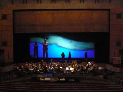 primeiro ensaio cénico em palco com projecções: a coisa funciona! sentado na plateia do grande auditório saboreio esse prazer raro de ter esta grande sala como tela. não há satisfação comparável numa folha de papel ou numa tela. esculpir imagens no tempo e no espaço com personagens musicais de carne e osso é outro assunto.