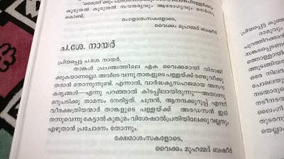 നി കൊ ഞാ ചാ എന്ന സിനിമാ പേര് കേട്ടപ്പോള് മനസില് തോന്നിയ ഒരാവേശമുണ്ട്. ഞാനടങ്ങുന്ന ന്യൂ ജനറേഷന്റെ പുതുമയില് അന്ന് ഊറ്റം കൊണ്ടിരുന്നു. ആ വിളിയുടെ സുഖം കേറുമ്പോള് ഞങ്ങളുടെ ജനറേഷന് മറ്റു ജനറേഷനുകളില് നിന്നും എന്തോ തിളക്കം കൂടുതലുണ്ട് എന്ന് അധികം ആയുസ്സില്ലാത്ത ഒരു തോന്നലും ഉണ്ടായിരുന്നു. ആ വിശേഷണത്തില് ഒരു കാര്യവുമില്ലെന്നും അത് കാലാകാലങ്ങളില് സംഭവിക്കുന്ന ഒന്ന് മാത്രമാണ് എന്നും അധികം വൈകാതെ ഉണ്ടായ തിരിച്ചറിവിന്റെ കൂടെ ചേര്ക്കേണ്ട ഒന്ന് കഴിഞ്ഞ ദിവസം സംഭവിച്ചു. ബഷീറിന്റെ കത്തുകള് എന്ന പുസ്തകത്തില് ബേപ്പൂര് സുല്ത്താന് 'പ്രിയപ്പെട്ട ച ശേ നായര്' എന്ന് വര്ഷങ്ങള്ക്കു മുന്പ് വൈക്കം ചന്ദ്രശേഖരന് നായരെ അഭിസംബോധന ചെയ്തിരിക്കുന്നു. അത്ഭുതം തോന്നുന്നു. മഹാന്മാര് മുന്പേ നടക്കുന്നു എന്ന് പറയുന്നത് എത്ര ശരിയാണെന്ന് ഒരിക്കല് കൂടി അറിയുന്നു.
