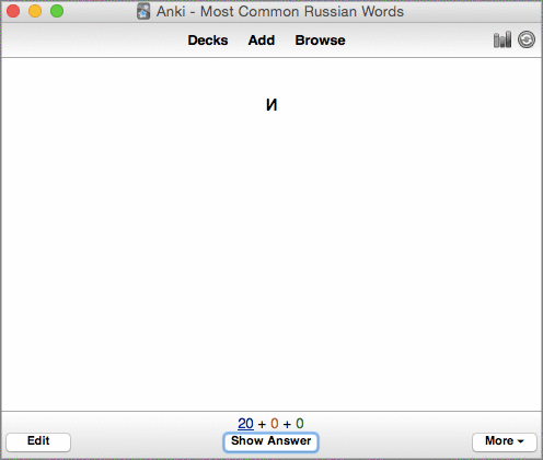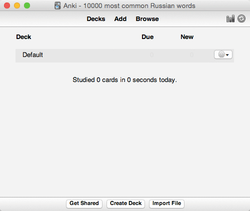 After you download a deck, click on Import file on the above window. Select the file — Anki Deck — that you have just downloaded. Then click on the title of the Deck to start studying the words. Press Study Now on the following window. (Note: If the name reads “10000 most frequent Russian words” irrespective of the deck you downloaded, you haven’t made a mistake. Just rename the file. The reason is I used the big deck to create the smaller decks