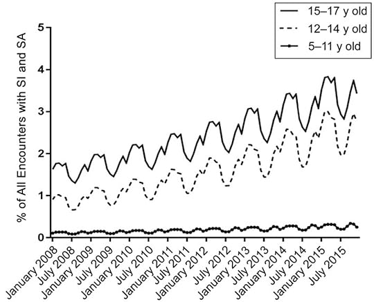 Since I had never heard this before, I decided to look into it, and several studies confirm Dr. Gray’s statement. One of the more disturbing studies I found was published three years ago. It looked at hospitalization in children’s hospitals for thoughts of suicide (SI – suicide ideation) or suicide attempts (SA). It covered 2008-2015, and the results are very clear. Consider, for example, Figure 2 from the study:
